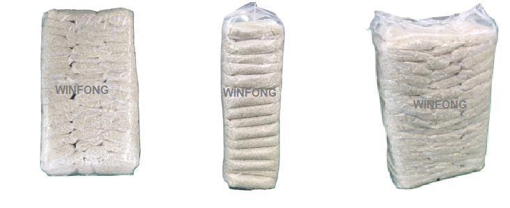 This packing unit includes one set of buffer belt conveyor, one set of climbing conveyor, one set of VFS110 secondary bag in bag packing machine and one set of take-off conveyor.