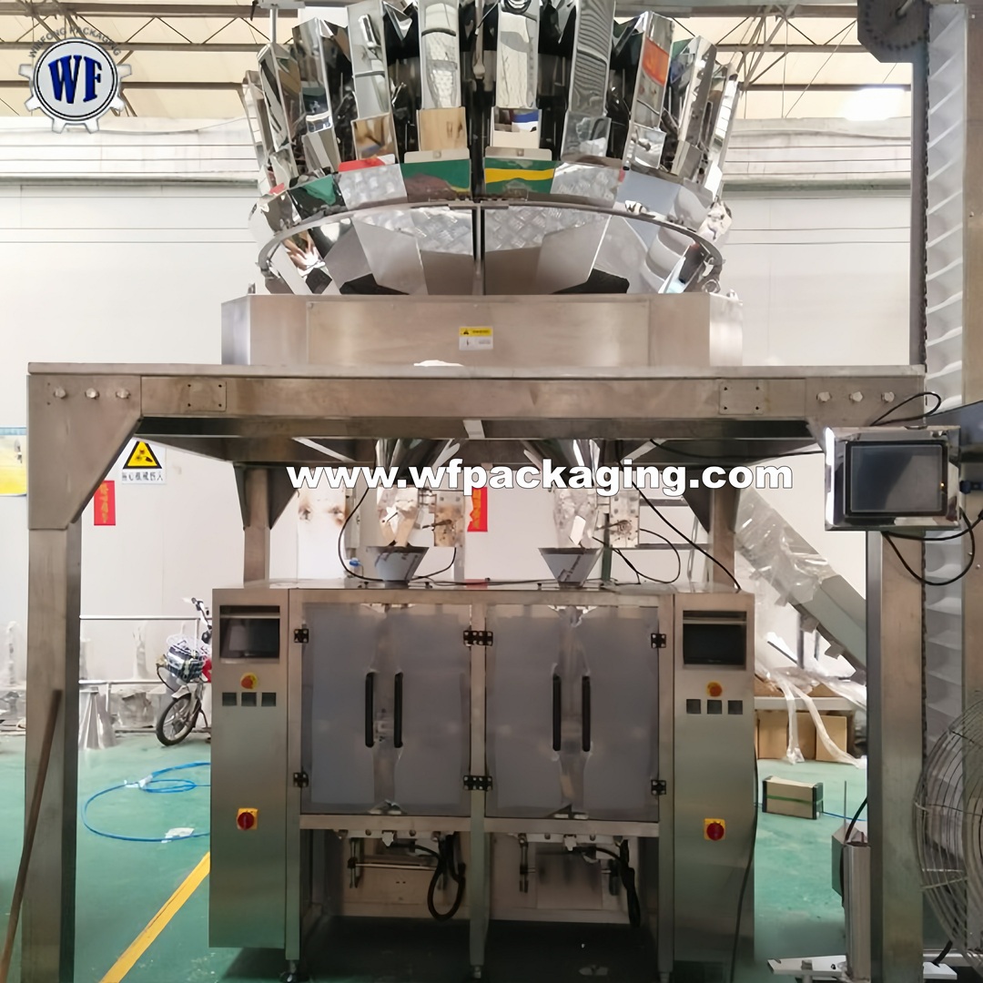 Z type bucket elevator feed materials to hopper of the multi-head weigher →Multi-head weigher will weighing and filling materials at target weight automatically → VFS bagging machine realize bag-making, filling, date printing, sealing, cutting, etc.→Take-off conveyor will convey out the finished bags automatically